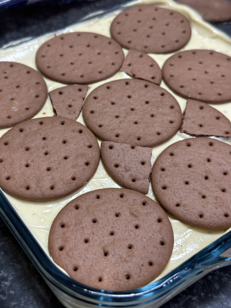 - Depois disso, faça uma camada com as bolachas.