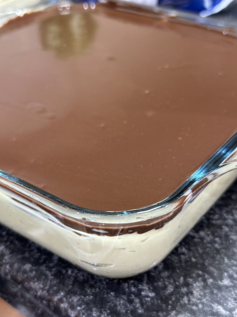 - Primeiramente, na travessa, distribua metade da ganache de chocolate no fundo.